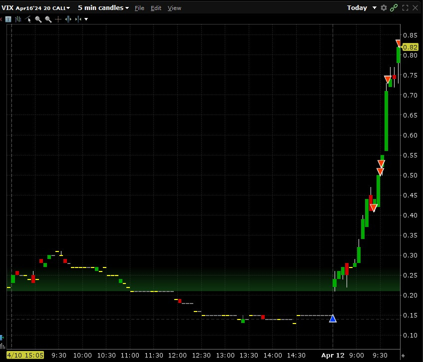 Während der Markt also am Freitagvormittag noch 'schlief' und sich einen solchen Angriff kaum vorstellen konnte, erwarb ich gelassen kurzfristige VIX Call-Optionen und längerfristige VIX Bull Call Spreads. Warum auch nicht? Die kurzfristigen VIX Calls (4 DTE) waren fast kostenlos – ein deutlicher Gegensatz zu anderen Produkten wie beispielsweise Öl Calls.