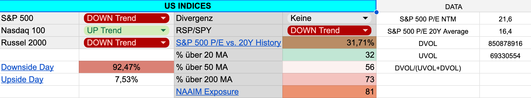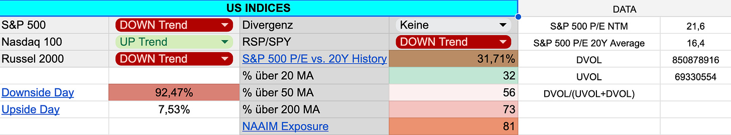 Man beachte: Das Downside-Day-Volume erreichte am Freitag 92,5%! Tage mit einem Downside-Volume von über 90% sind selten und weisen erstmals seit längerer Zeit auf panische Verkäufe hin. Solche panischen Verkäufe können den Boden einer kurzfristigen Korrektur markieren, müssen jedoch durch einen 90% Upside Day oder zwei 80% Upside Days bestätigt werden. Ohne diese Bestätigung dienen sie lediglich als erstes Warnsignal, dass die Verkäufe ernst zu nehmen sind. Die letzten 90% Downside Days traten während der Korrektur 2022 und natürlich im Corona-Crash auf. Beide Korrekturen und die jeweilige Bodenbildung, einschließlich des Bodens im Oktober 2023, wurden durch mehrere 90% Upside Days bestätigt und aufgelöst.