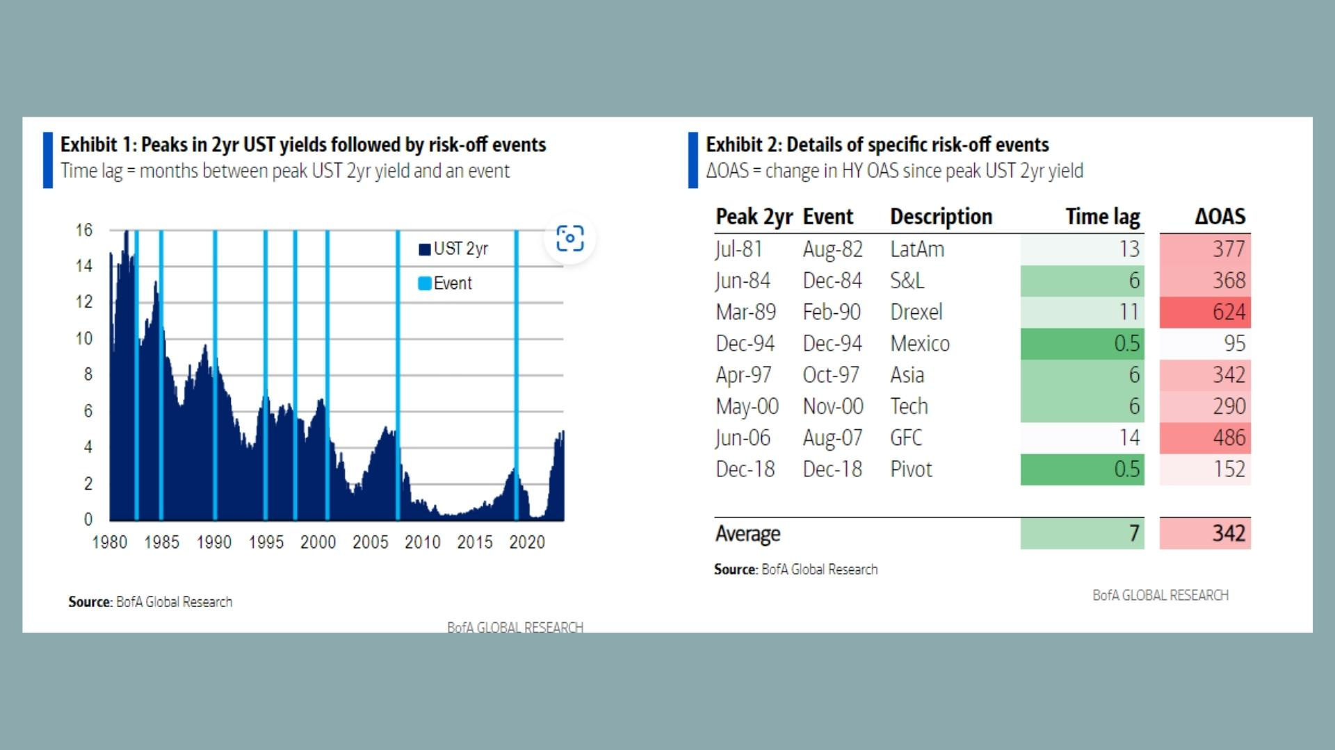 Eine Grafik von der Bank of America zeigt noch einmal deutlicher, dass jeder Peak in den Zinsen (US 2 Year) zu einem Risk-off-Event führt.