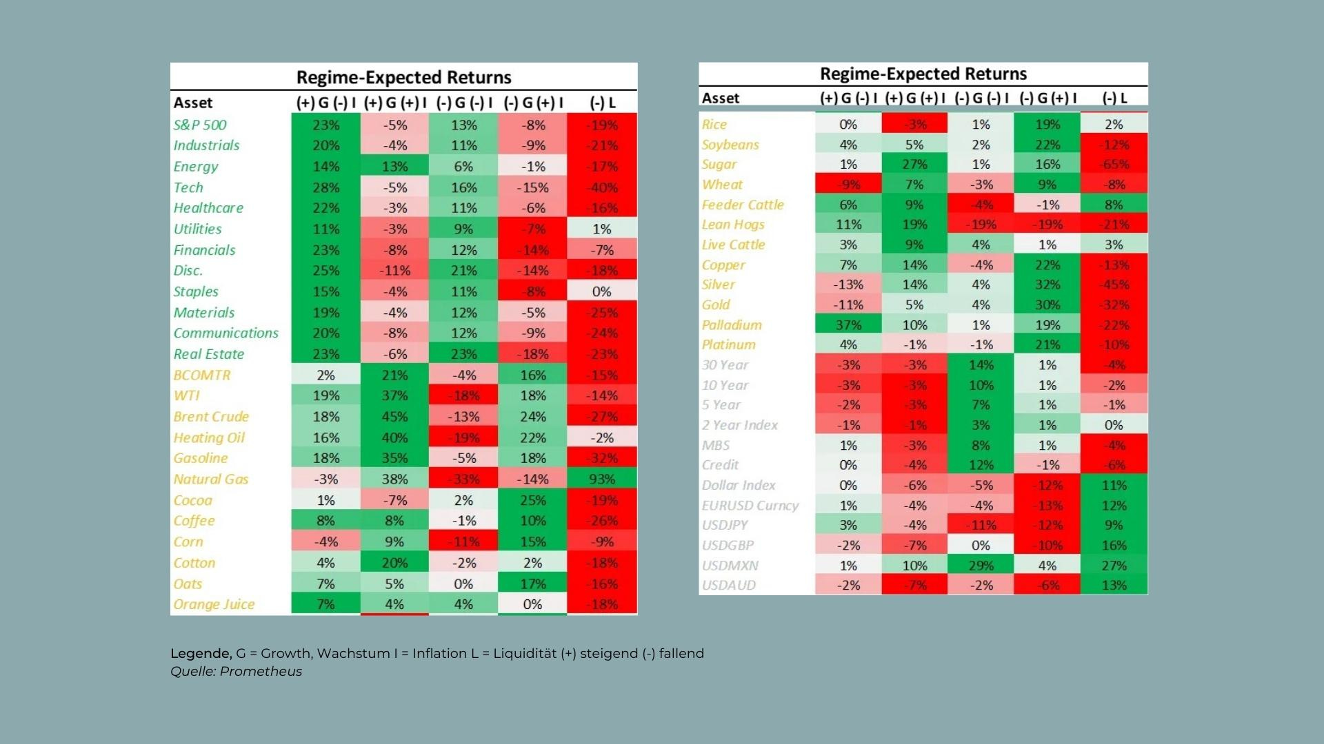 Im zweiten Schritt schaue ich mir die Inflationsdynamik an und prüfe, ob wir ein positives oder negatives Wachstum haben. Aufgrund dieser Kombinatorik ergeben sich vier mögliche Szenarien, jedes mit seinen eigenen Vor- und Nachteilen für verschiedene Assetklassen.