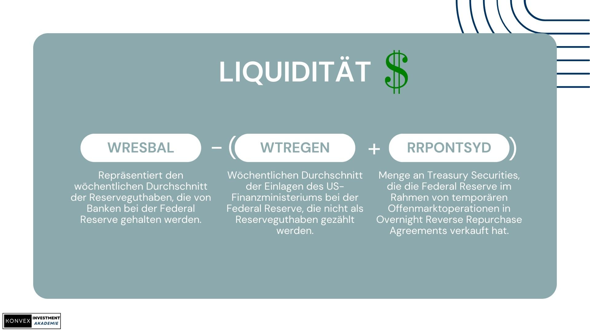Die Formel zur Berechnung der verfügbaren Liquidität im Finanzsystem berücksichtigt das Geld, das Banken als Reserve bei der Federal Reserve halten (WRESBAL), das Geld, das das US-Finanzministerium bei der Federal Reserve deponiert hat (WTREGEN), und das Geld, das die Federal Reserve von den Banken geliehen hat (RRPONTSYD). Ich nutze also eine leicht angepasste Version der Liquiditätsmessung. Die nachfolgende Grafik stellt meinen angepassten Liquiditätspool dar.