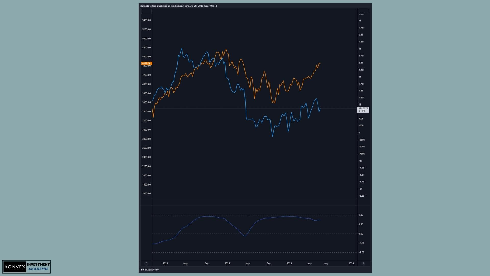 Mit einem tieferen Blick auf den Liquiditätspool und die Darstellung in einem Chart, der den S&P500 mit der Liquidität im Finanzsystem vergleicht, lässt sich der Zusammenhang und der Einfluss der Liquidität auf die Assetpreise verdeutlichen. Zum Beispiel lässt sich der Rückgang der Liquidität im Jahr 2022 und dessen Zusammenhang mit dem Tiefstand im Aktienmarkt im Oktober 2022, als die Liquidität wieder zu steigen begann, gut nachvollziehen.