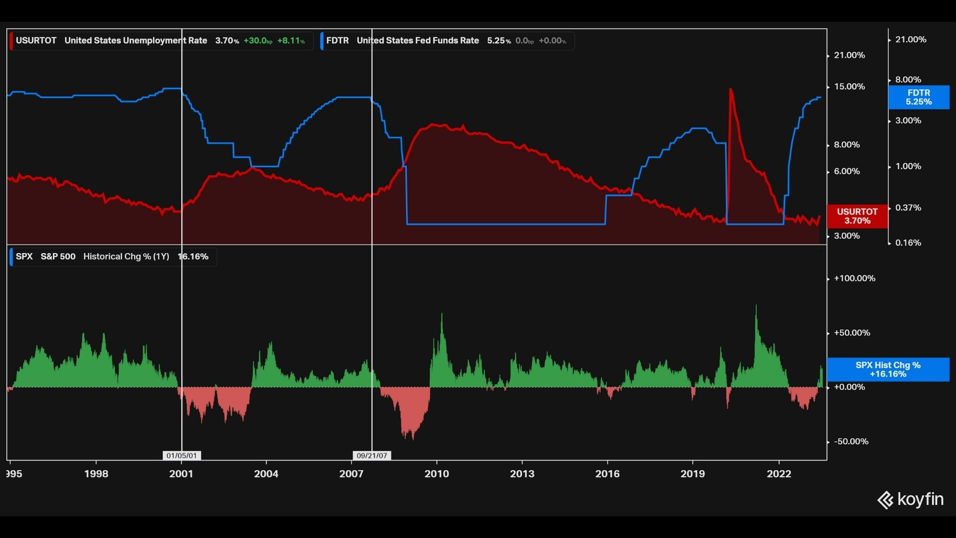 Ein Blick auf die Fed Funds Rate, die Arbeitslosenquote und die historische Performance des S&P500 zeigt deutlich die sehr schlechte Aktienperformance, wenn die erwarteten Zinskürzungen tatsächlich eintreten. Zinskürzungen, genau wie Zinsanhebungen, wirken mit einer Verzögerung von 12-18 Monaten. Es ist daher nicht verwunderlich, dass trotz Zinssenkungen der Markt erst einmal fällt. Die FED senkt fast immer die Zinsen, wenn etwas im Argen liegt, nicht weil sie ihre Ziele erreicht hat. Dann ist es aber leider oft schon zu spät.