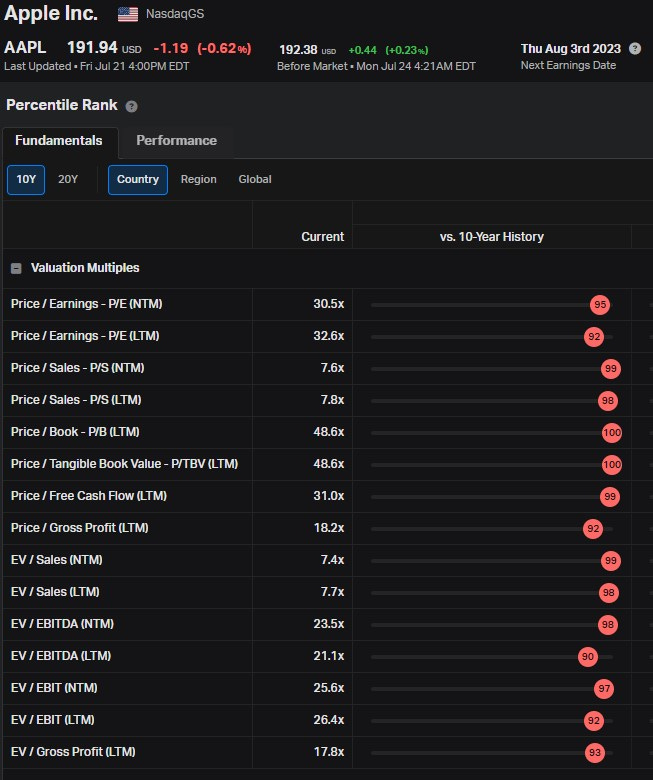 1. Price / Earnings - P/E (NTM/LTM): Dies ist das Kurs-Gewinn-Verhältnis (KGV) für die nächsten (NTM) oder letzten (LTM) zwölf Monate. Diese Metrik setzt den aktuellen Aktienkurs eines Unternehmens in Relation zu seinem erwarteten oder tatsächlichen Gewinn pro Aktie.