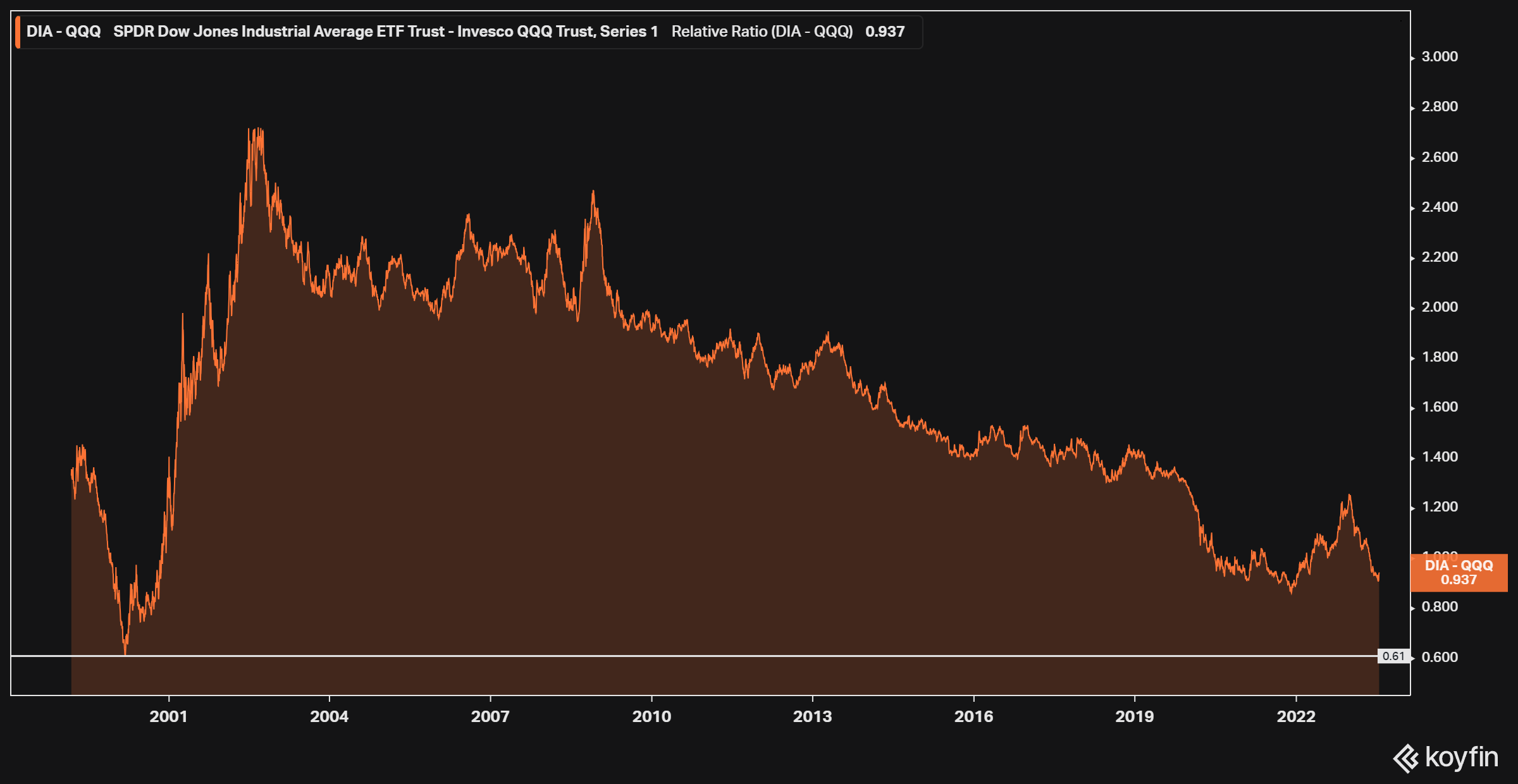 Das Verhältnis zwischen dem Dow Jones und dem Nasdaq 100 ist mittlerweile fast wieder auf dem Niveau von 2021, als das Hoch der Technologieaktien markiert wurde. Es ist auch nicht mehr weit entfernt vom Tiefstand des Jahres 2000. Es muss natürlich erwähnt werden, dass die Vergleiche mit dem Jahr 2000 nicht passen. Die großen Technologieunternehmen haben im Vergleich zu damals ein enormes Nettoeinkommen, massiven positiven Cashflow und extrem hohe Cashreserven. Außerdem muss sich das Verhältnis zwischen dem Dow Jones und dem Nasdaq 100 nicht unbedingt auflösen, indem der Dow Jones stark steigt. Es reicht natürlich aus, wenn der Dow Jones weniger stark fällt als der Nasdaq 100.