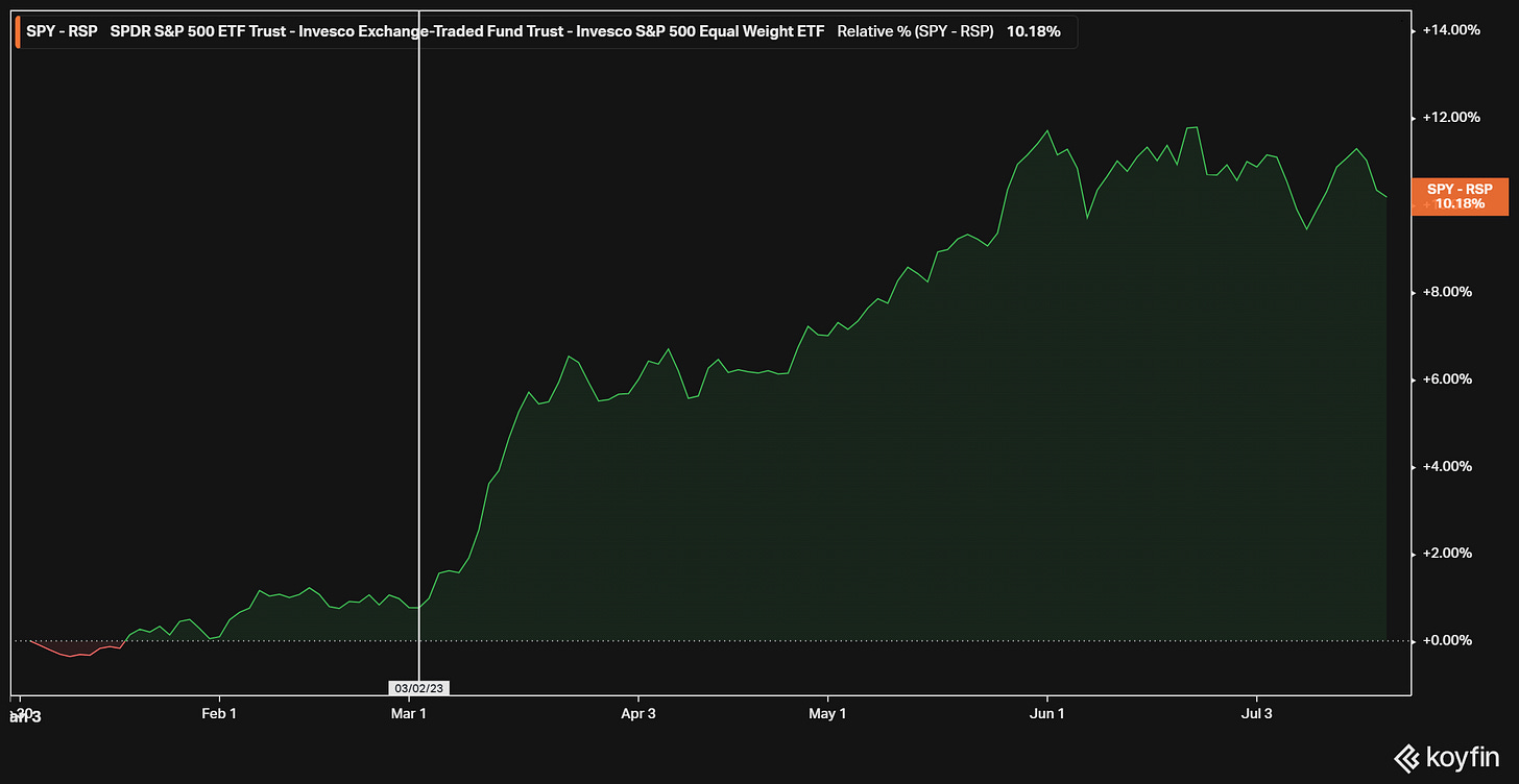 Falls man sich fragt, ob die aktuelle Rallye im S&P500 breit gefächert ist oder nur auf wenige Werte zurückzuführen ist, schaut man sich die Differenz zwischen dem SPY und dem RSP ETF an.