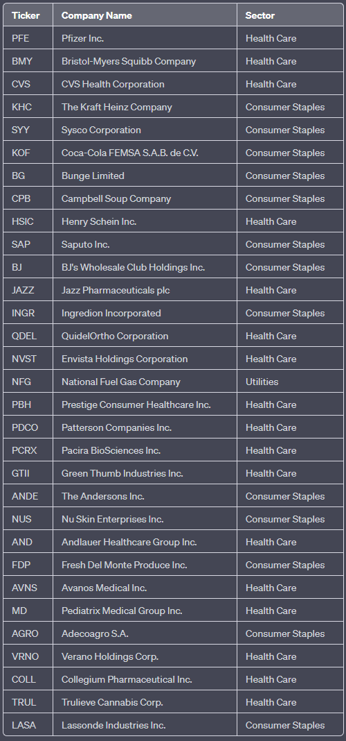Am Ende kommen von über 3.000 defensiven Unternehmen gerade einmal 31 Unternehmen in Frage! Dabei muss allerdings bedacht werden, dass die Filter keine vollständige, fundamentale Bewertung ersetzen. Je nachdem, wie gewissenhaft man handelt, muss man natürlich noch ins Detail gehen. Außerdem werden einige Unternehmen, zumindest für Stillhaltergeschäfte, aufgrund ihrer geringen Liquidität und großen Spreads in der Optionskette, nicht berücksichtigt. Dennoch möchte ich diese Unternehmen nicht durch spezifischere Filter ausschließen, da meine Anlagestrategien nicht ausschließlich auf Stillhaltergeschäften basieren.