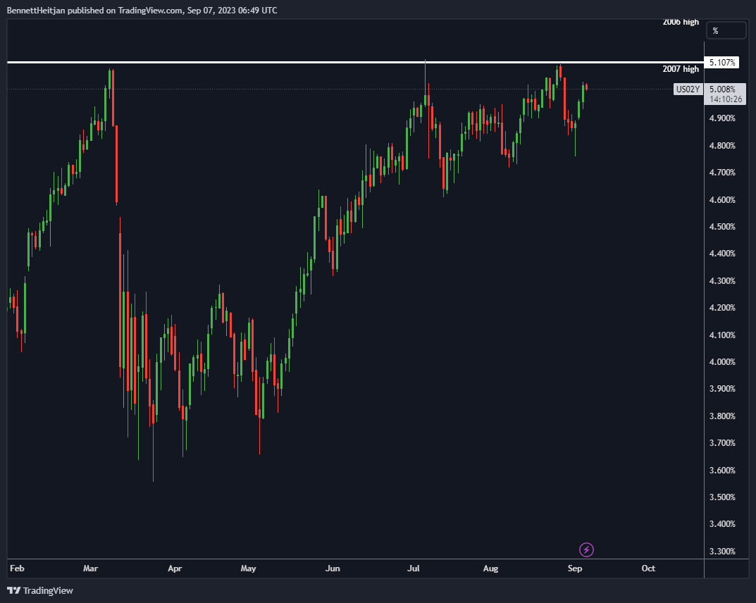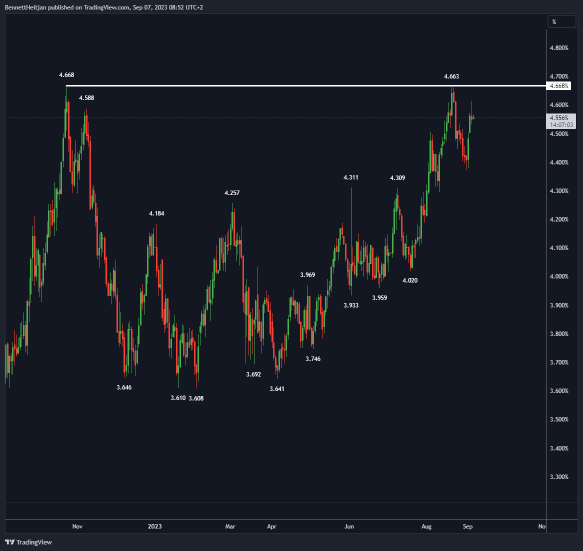 Betrachtet man die 2-jährigen Anleihen, stellt man fest, dass trotz der heftigen und starken Bewegungen bisher kein neues Zyklushoch erreicht wurde. Die Höchststände wurden stets eingehalten.
