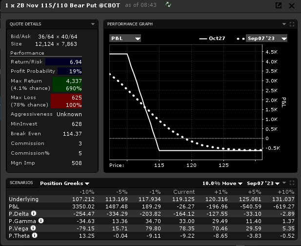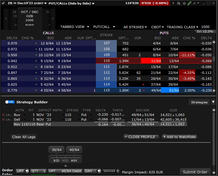 Dabei bieten sich plain vanilla Bear Put Spreads an. Man kann hierbei auch kreativ vorgehen. Hat man beispielsweise ein spezifisches Zinstarget (z.B. 5%), könnte man auch Butterfly-Strategien in Betracht ziehen. Ich bevorzuge jedoch den einfachen Ansatz. Achtung: Der Multiplikator der Optionen beträgt hier nicht 100, sondern 1000! Daher empfiehlt sich ein Kontrakt (oder Optionskombo) pro z. B. 1000 TLT-Anteile.