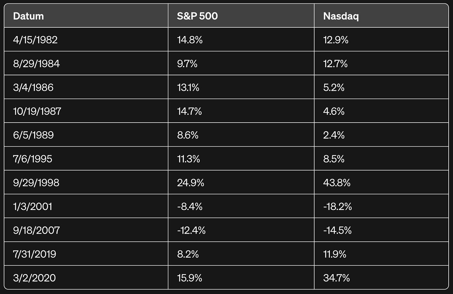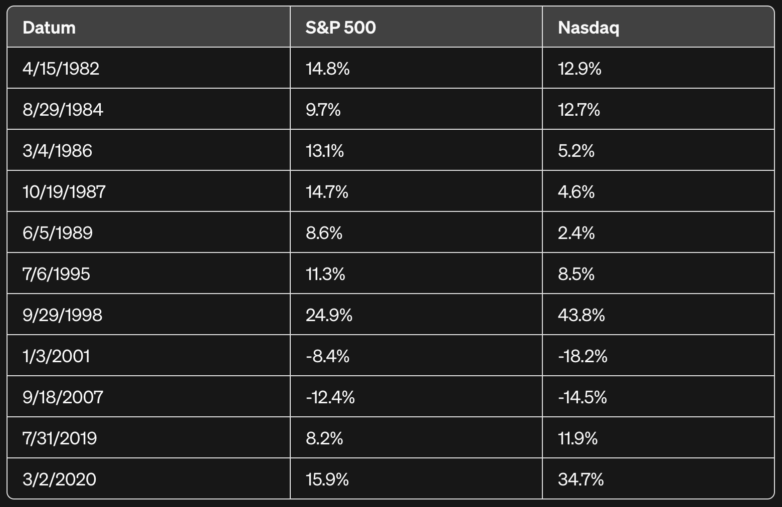 Hier folgt eine Übersicht zur generellen Performance des S&P 500 und des Nasdaq 100, sechs Monate nach der ersten Zinssenkung: