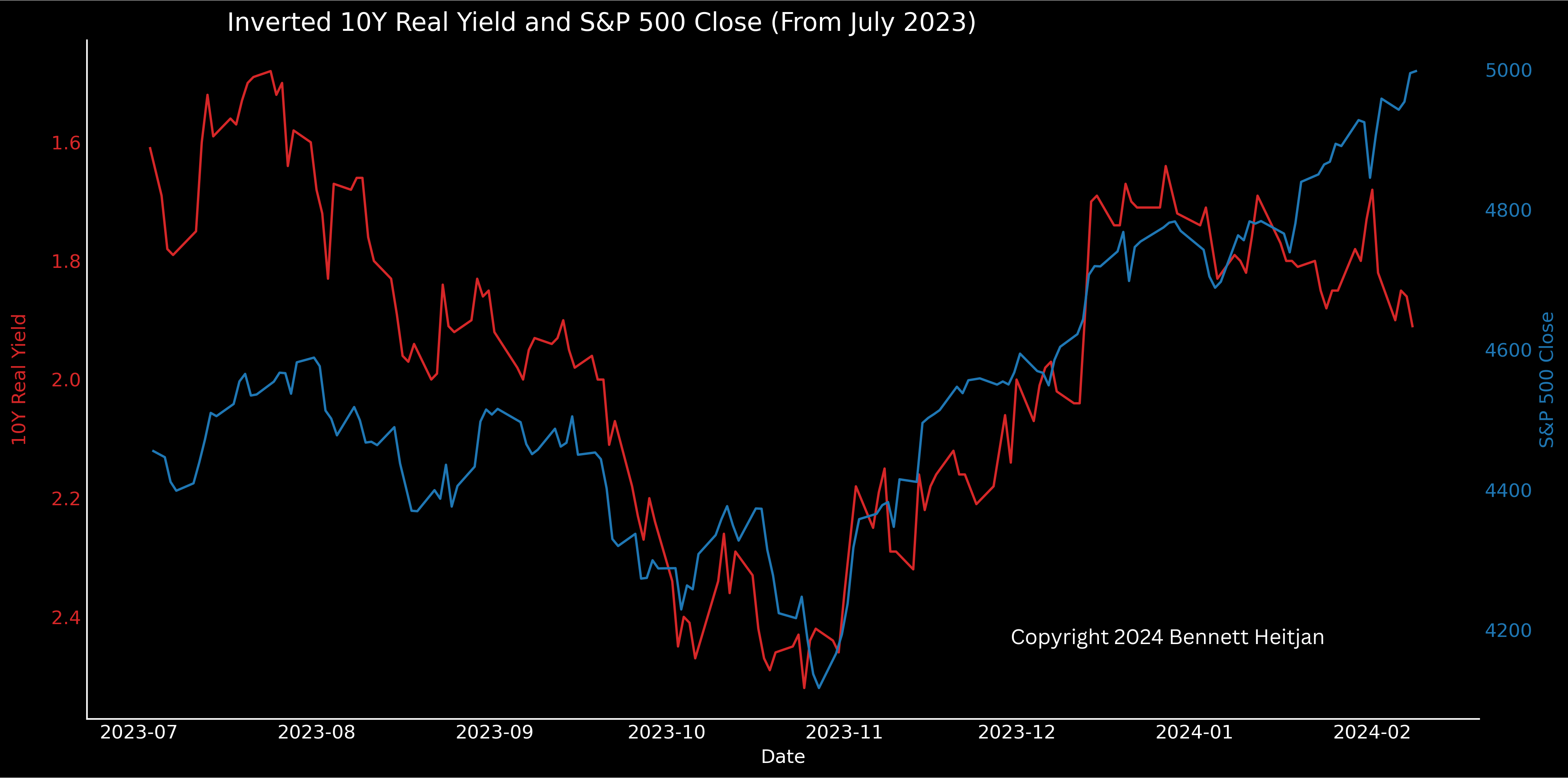 In Rot dargestellt sind die 10-jährigen US-Realrenditen (invertiert), während der S&P 500 in Blau auf der rechten Y-Achse abgebildet ist.