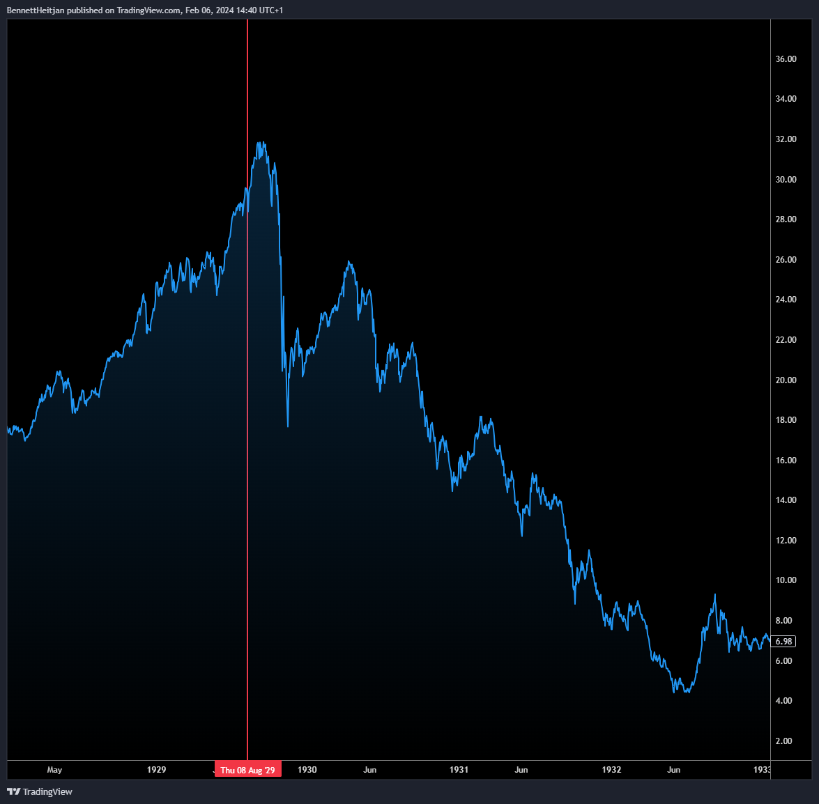 Im Anschluss verzeichnete der S&P 500 einen Anstieg von 10% und erlebte daraufhin einen Rückgang von über 85%. Ich bin kein Anhänger einer Doom-and-Gloom-Mentalität, sondern vielmehr von wissenschaftlichen und statistischen Methoden sowie von einem probabilistischen Denkansatz überzeugt. Daher sollten solche Charts und Daten eher als interessante Anekdoten betrachtet werden. Sie dienen gleichsam als 'Memento mori' für den Aktienmarkt. Doch genauso wenig, wie ich mein gesamtes Verhalten abrupt ändern würde, nur weil mir bewusst ist, dass ich irgendwann sterben werde, sollte man aufgrund dieser Erkenntnis nicht überstürzt am Aktienmarkt handeln.