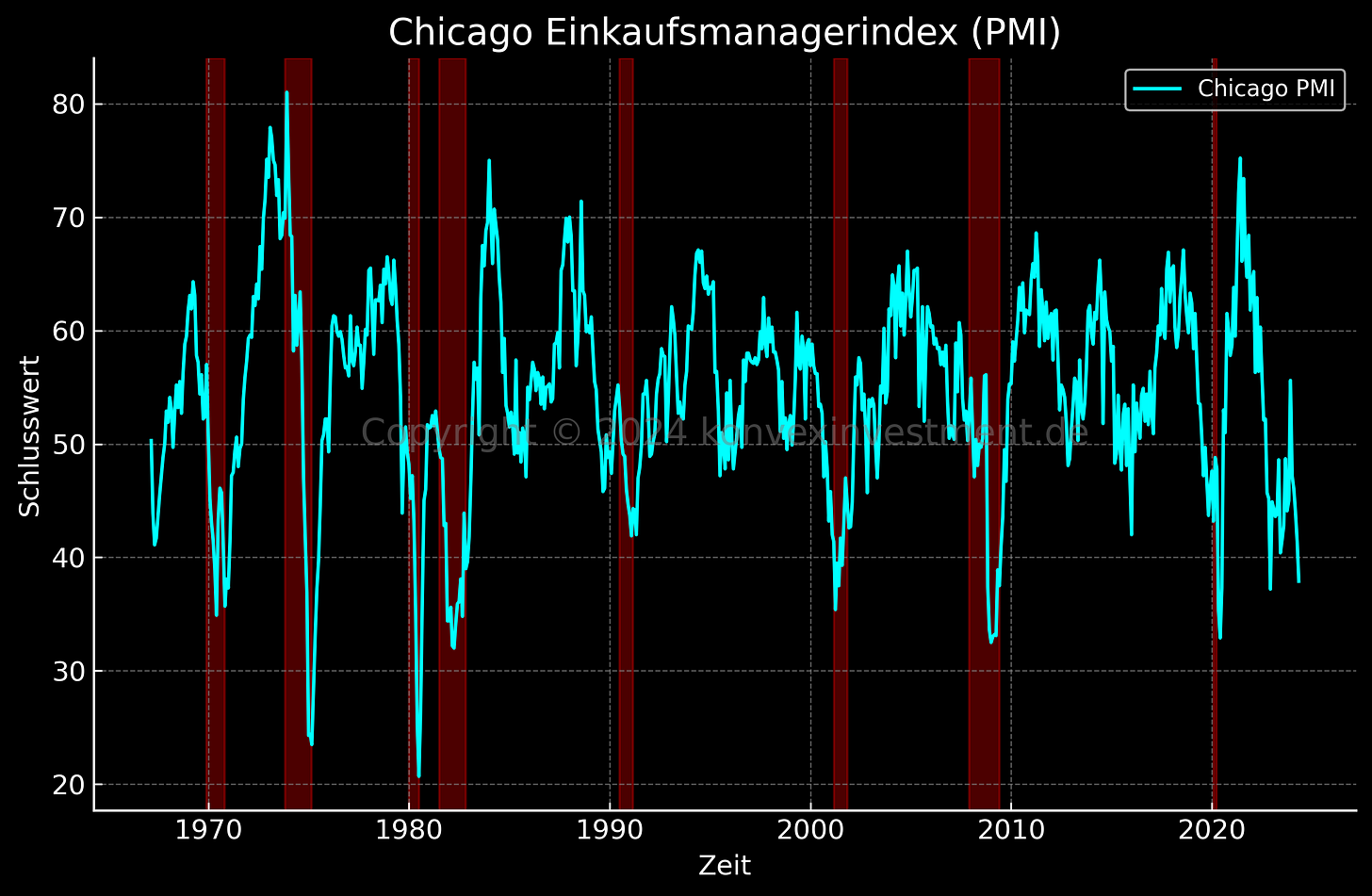 Bleiben wir aber vorerst bei den schlechten Nachrichten. Der Chicagoer Einkaufsmanagerindex (PMI), veröffentlicht am 31.05. (mein Geburtstag), fiel deutlich niedriger aus als erwartet und erreichte ein Niveau, das historisch gesehen fast immer mit einer Rezession einhergeht. Der aktuelle Wert von 35,4 im Chicagoer Einkaufsmanagerindex weist auf eine signifikante Kontraktion in der wirtschaftlichen Aktivität des verarbeitenden Gewerbes und der Dienstleistungen in der Region Chicago hin. Dies liegt deutlich unter der neutralen Schwelle von 50, die den Übergang zwischen Wachstum und Kontraktion markiert.