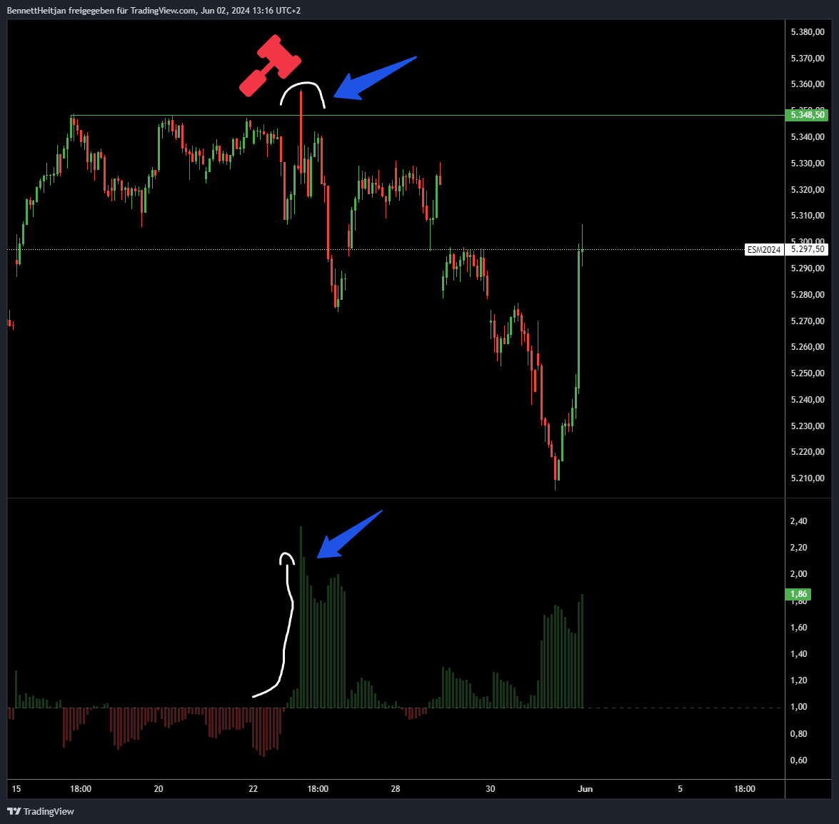 Vor den Nvidia-Ergebnissen befanden sich die Futures in einer Konsolidierungsphase mit sehr geringem relativen Volumen (rot = unterdurchschnittlich). Nach den positiven Nachrichten von Nvidia kam es dann zu einem Ausbruchsversuch, der neue Höchststände erreichen sollte, begleitet von hohem relativem Volumen. Doch unmittelbar nach der Eröffnung der US-Börsen um 15:30 Uhr setzte ein Verkaufsdruck ein. Als der S&P 500 daraufhin zurückfiel und der Ausbruch trotz scheinbar optimaler Bedingungen scheiterte, war eindeutig von einem gescheiterten Ausbruch zu sprechen.