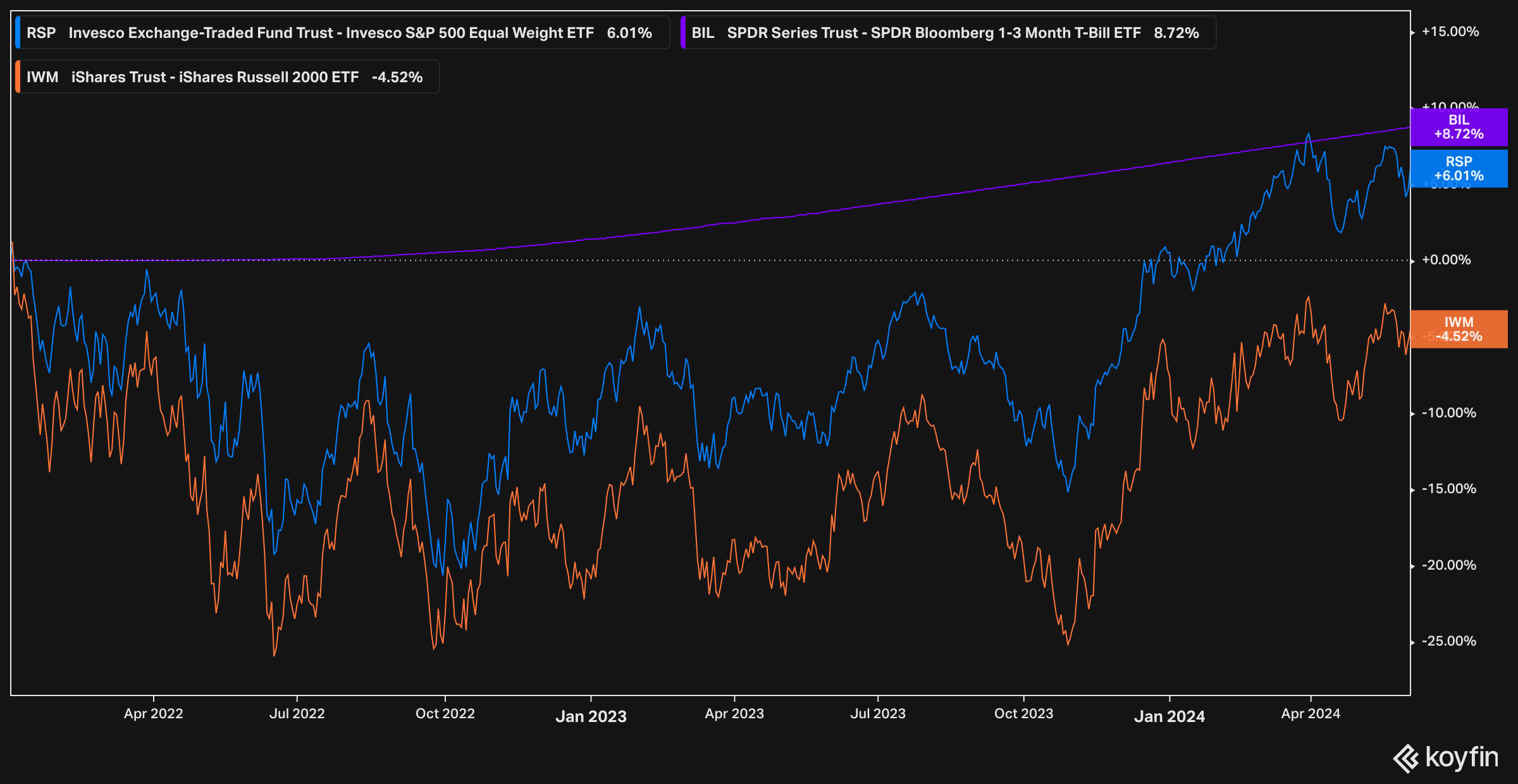 Unglaublich, aber wahr: der breite Aktienmarkt leidet. Ein Blick auf den gleichgewichteten S&P 500 (RSP) oder den Russell 2000 (IWM) zeigt, dass Anlagen in Cash (t-Bills) in den letzten zwei Jahren (seit Anhebung der Zinsen) deutlich attraktiver gewesen wären – sie boten mehr Rendite und keine Schwankungen. Der breite Aktienmarkt erreicht gerade einmal einen Total Return von 6%, während Investoren zwischendurch Einbrüche von bis zu 25% erleben mussten! Und dieser Vergleich ist eigentlich viel zu unfair, denn im ersten Jahr erzielte Cash kaum Rendite.