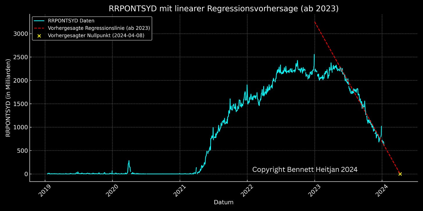 Das wohl derzeit am häufigsten diskutierte Finanzdiagramm in Fachkreisen ist das der Reverse-Repo-Fazilität. Ich habe in meinen Videos bereits mehrfach darauf Bezug genommen. Viele Aspekte, die dem Markt normalerweise Liquidität entziehen würden, können durch dieses Instrument abgemildert werden. Allerdings wird die vorhandene 'exzessive Liquidität' bald erschöpft sein. Um nicht dasselbe Diagramm wie alle anderen zu verwenden, habe ich ein eigenes erstellt und eine Regressionsanalyse durchgeführt, um grob abschätzen zu können, wann die Liquidität wohl erschöpft sein wird.
