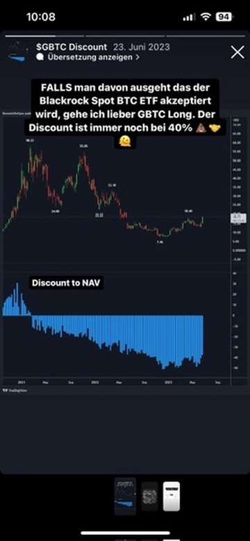 Die Maxime 'Buy the rumor' ist leicht auszusprechen, aber die eigentlichen Long-Trades waren bereits vor über einem halben Jahr. Es scheint eine Ewigkeit her. Am 23. Juni 2023 wies ich in verschiedenen Beiträgen darauf hin, dass das bessere Risiko-Ertrags-Verhältnis im GBTC zu finden sei, da dieser mit einem erheblichen Abschlag (40%) gegenüber dem Nettoinventarwert (NAV) gehandelt wird. Zudem war bei der Zulassung eines ETFs ein Uplisting zu erwarten (vom Pink Sheet OTC zur Nasdaq), was den Abschlag reduzieren würde – allein schon durch die Erwartungshaltung. Ich stellte auch eine risikoärmere Methode vor, bei der man BITO (BTC Future ETF) shortet und gleichzeitig in GBTC long geht. Damit spekulierte man ausschließlich auf die Reduzierung des Abschlags, ohne direkte BTC-Marktexposition.